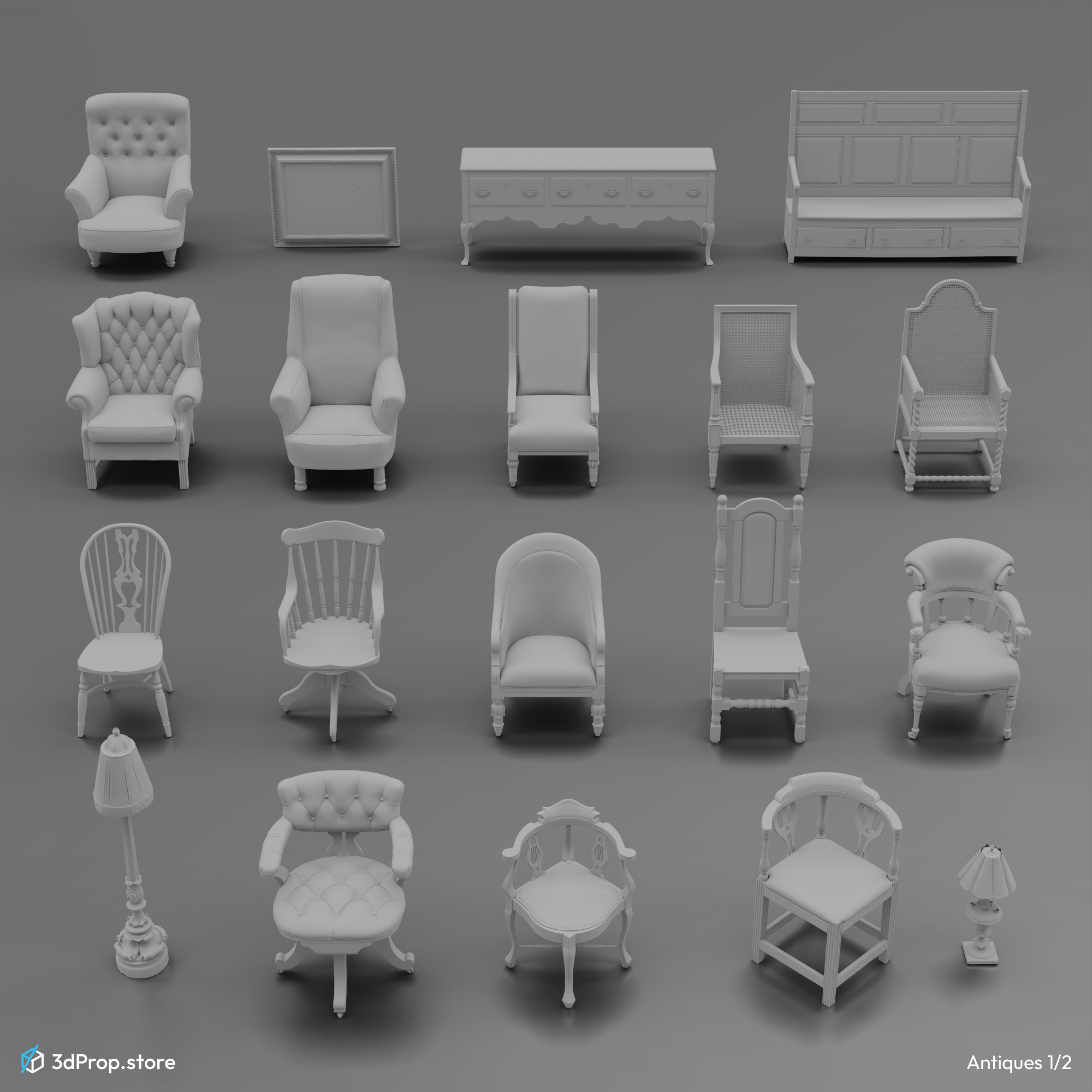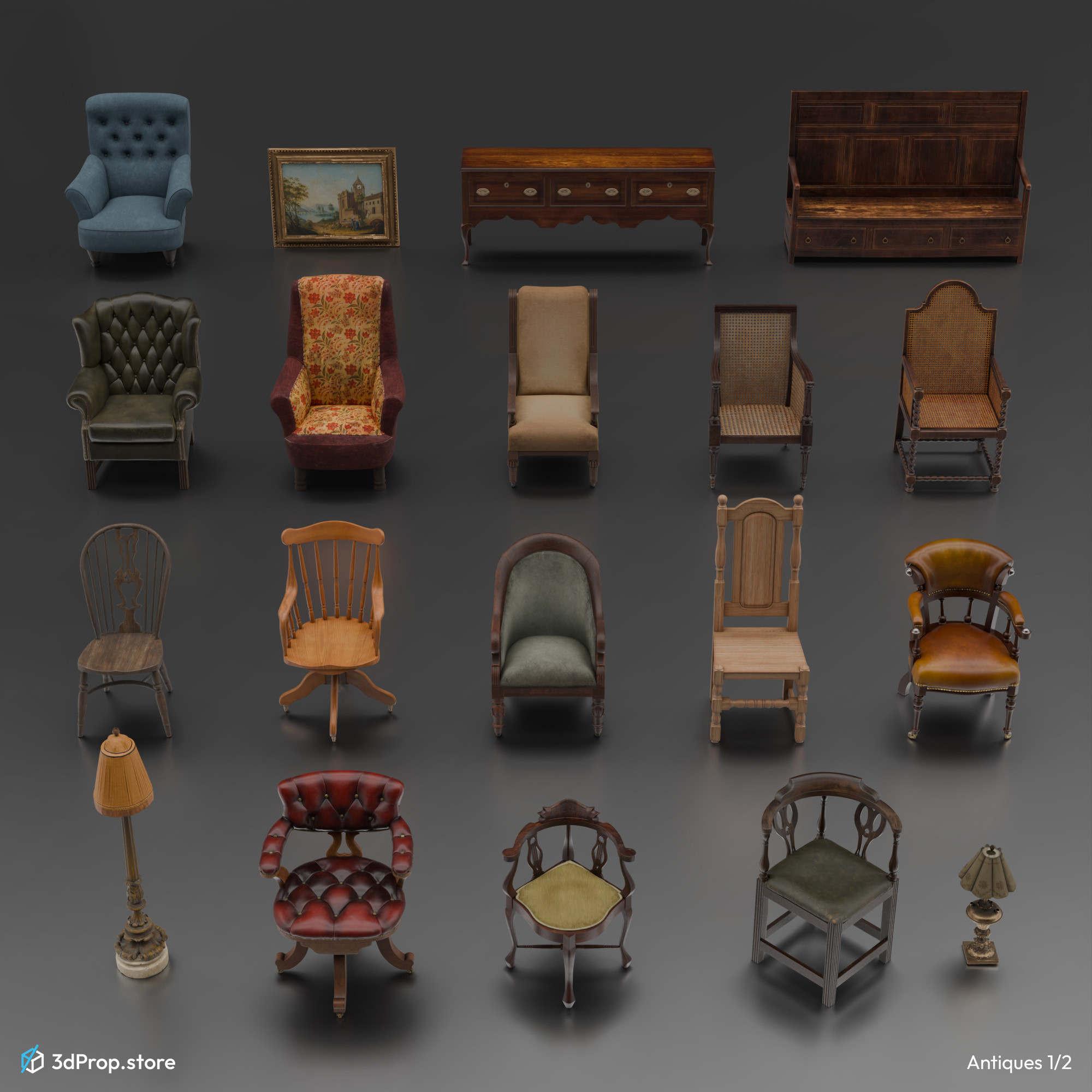 This bundle includes 40 assets, all 3D models (furnitures and small props) from across the 17th to the 20th century.